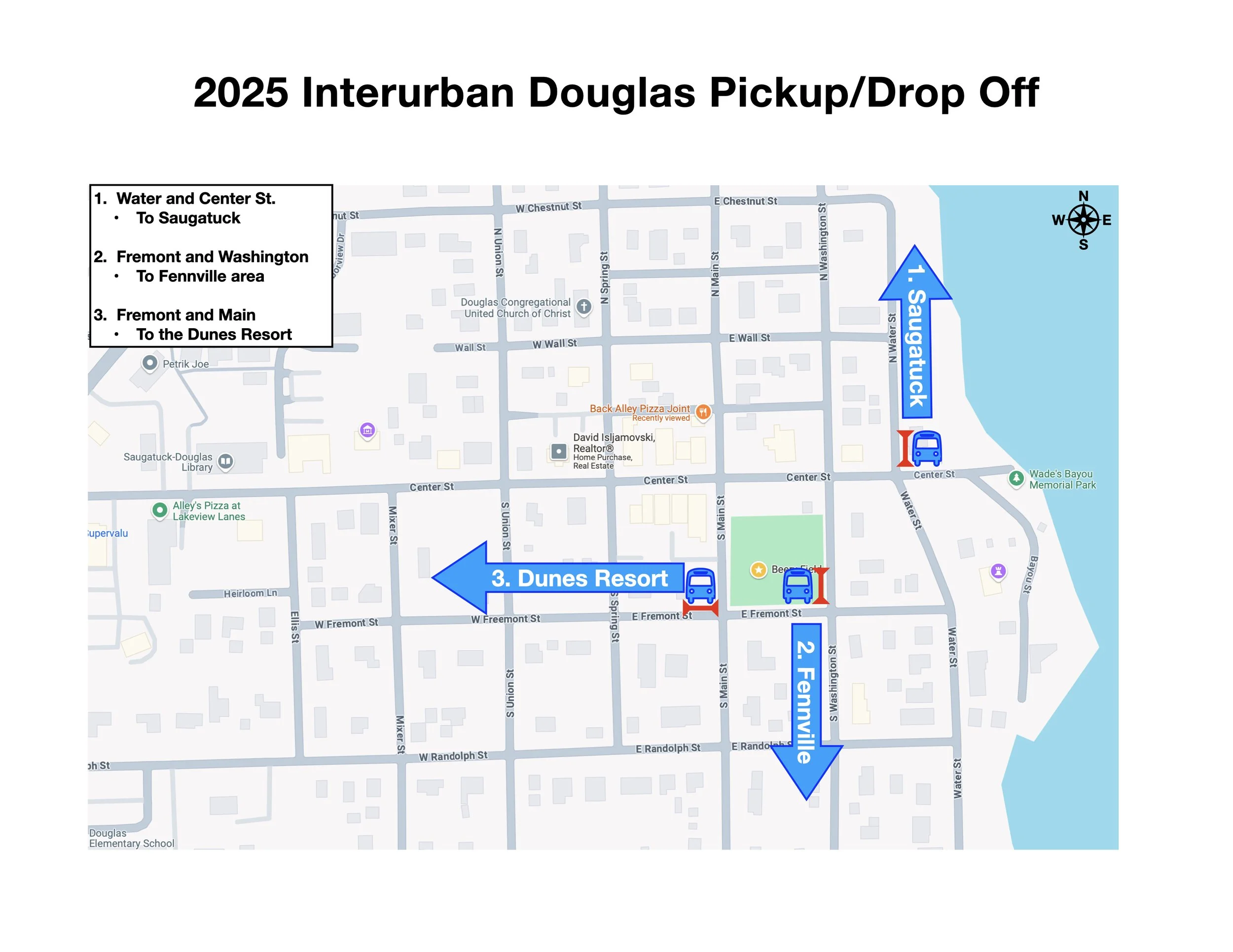 The Interurban Transit Authority graciously runs regular shuttles at no charge and provides on-demand pickup, from anywhere in the Saugatuck Douglas area. Please be patient as they are inundated with riders on parade night. They’ll get to you! If you don’t get through right away, call back.